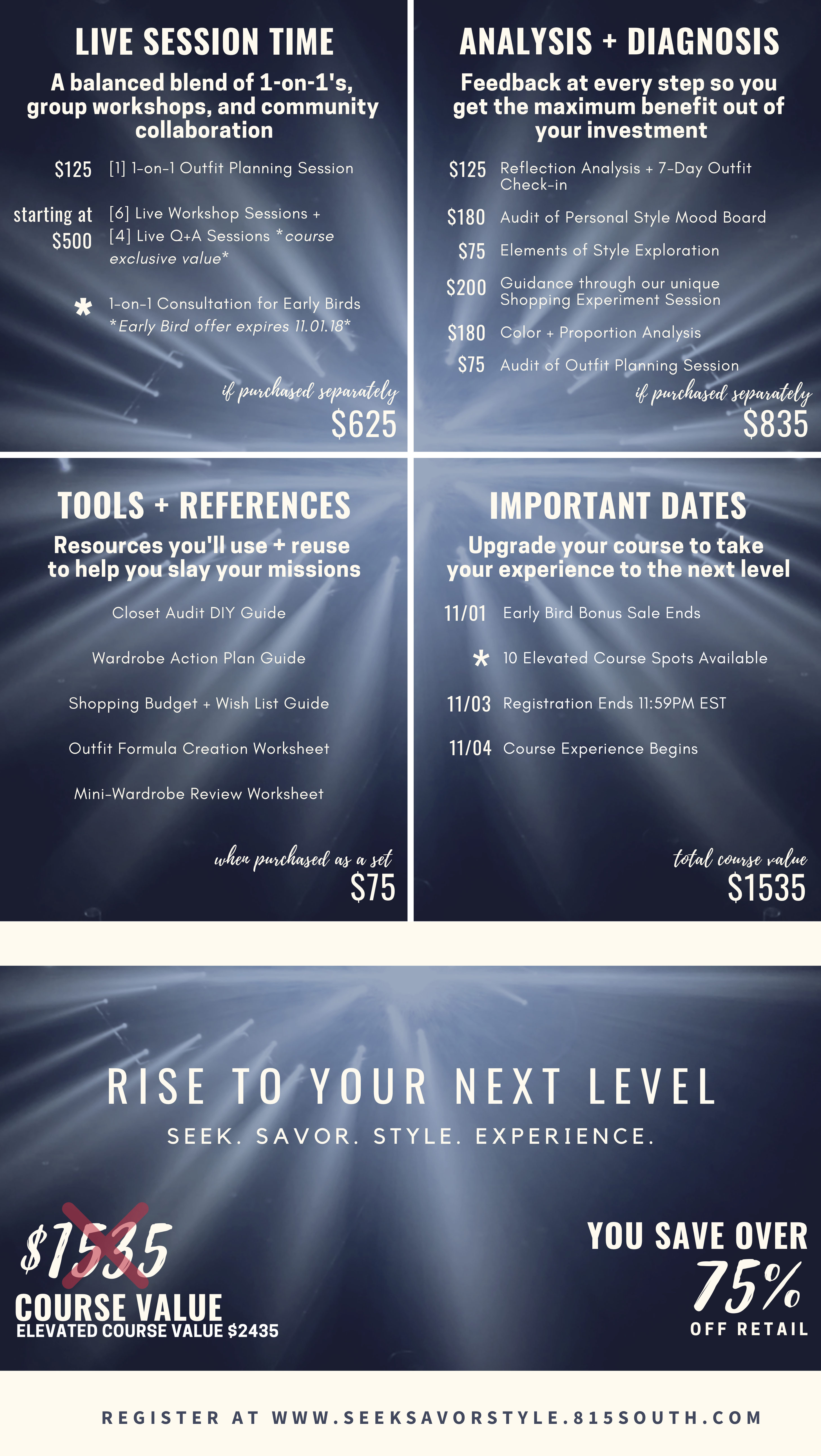 I’ll be working intimately with a select group of people to generate their most powerful and transformative changes. You’ll go through elements of the 815south + SeekSavorStyle signature methods at a fraction of the price you’d pay for a 1-on-1 package. You’ll also get access to everything from carefully designed missions to unique processes that are constructed to inspire change. You’ll have the flexibility to tackle it all on your own schedule, but with my feedback and support along the way.