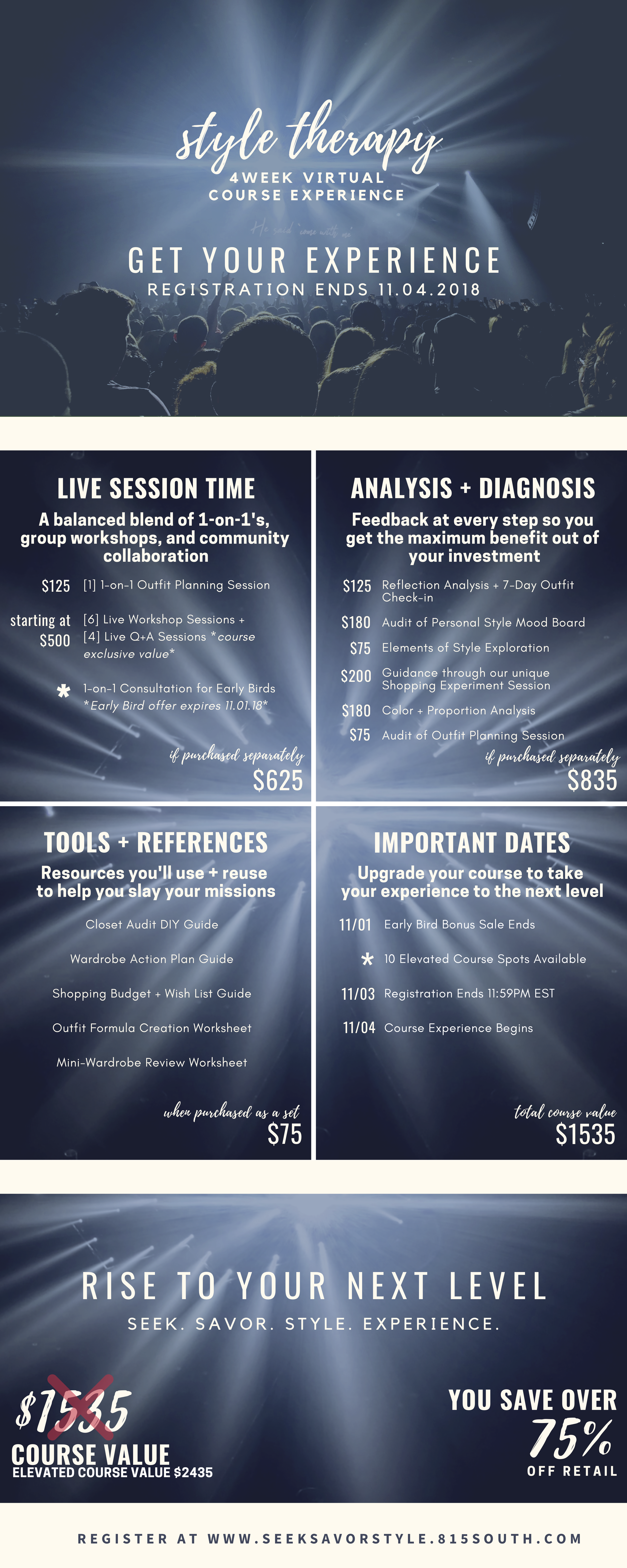 •  During the Early Bird Sale, the Standard Course Experience is $247 and the Elevated Course Experience is $547.
