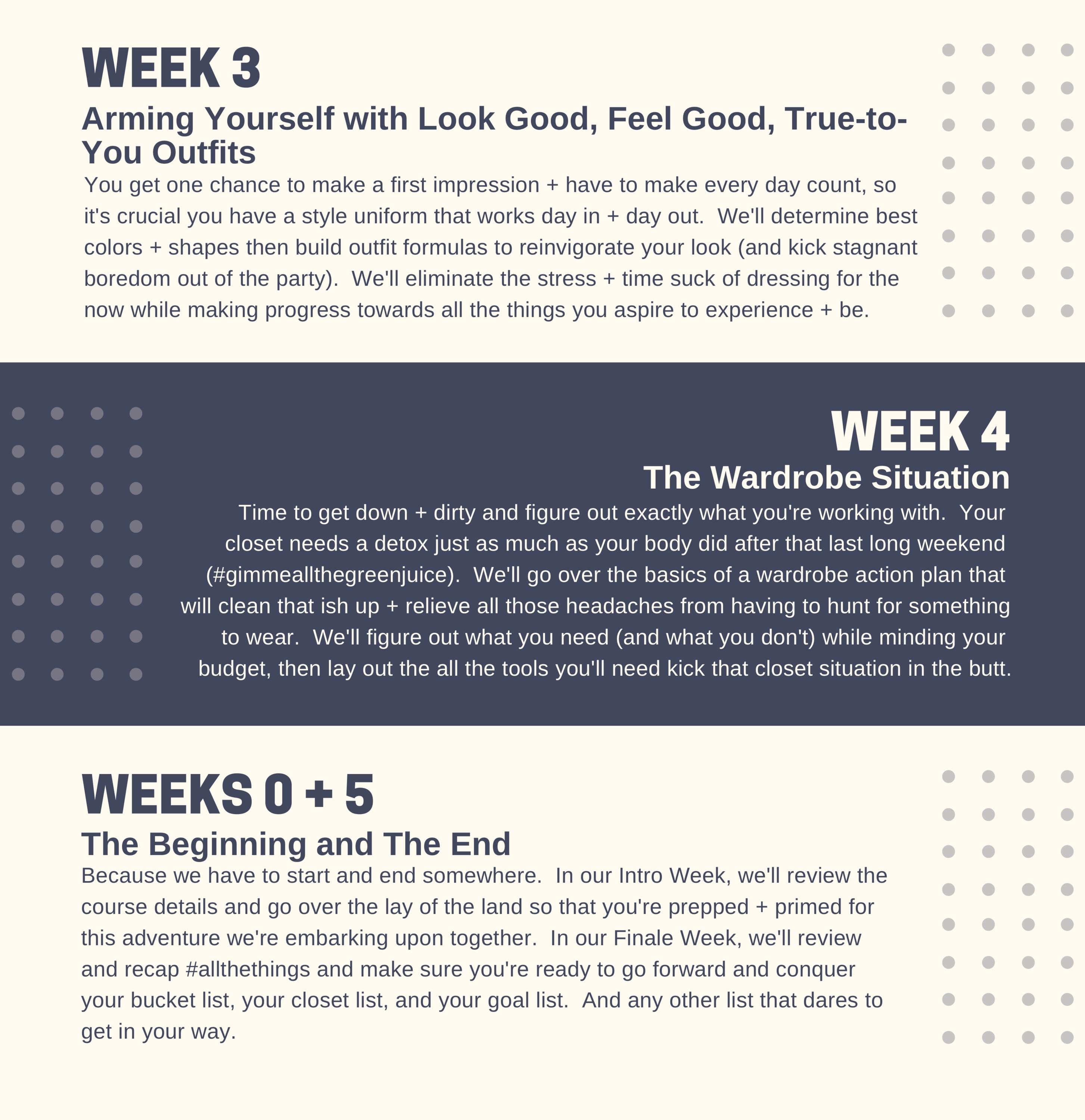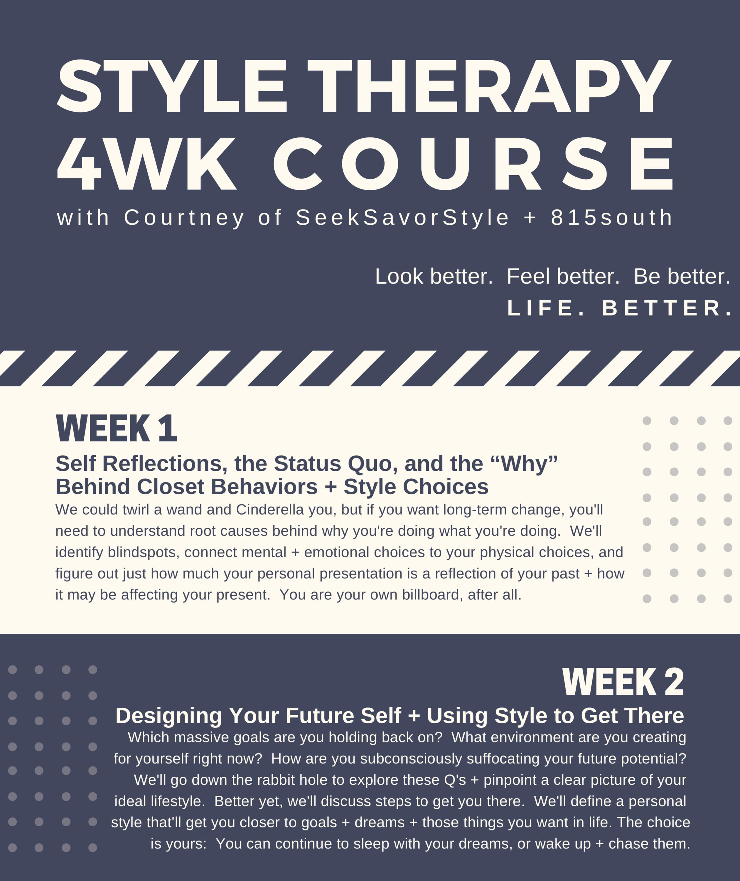 Throughout the course, we’ll use signature methods to elevate your perception of who you are and where you’re going, design your ideal lifestyle, and style your best pieces according to your own personal aesthetic.  Here's a taste of what you'll get and what we'll go through!