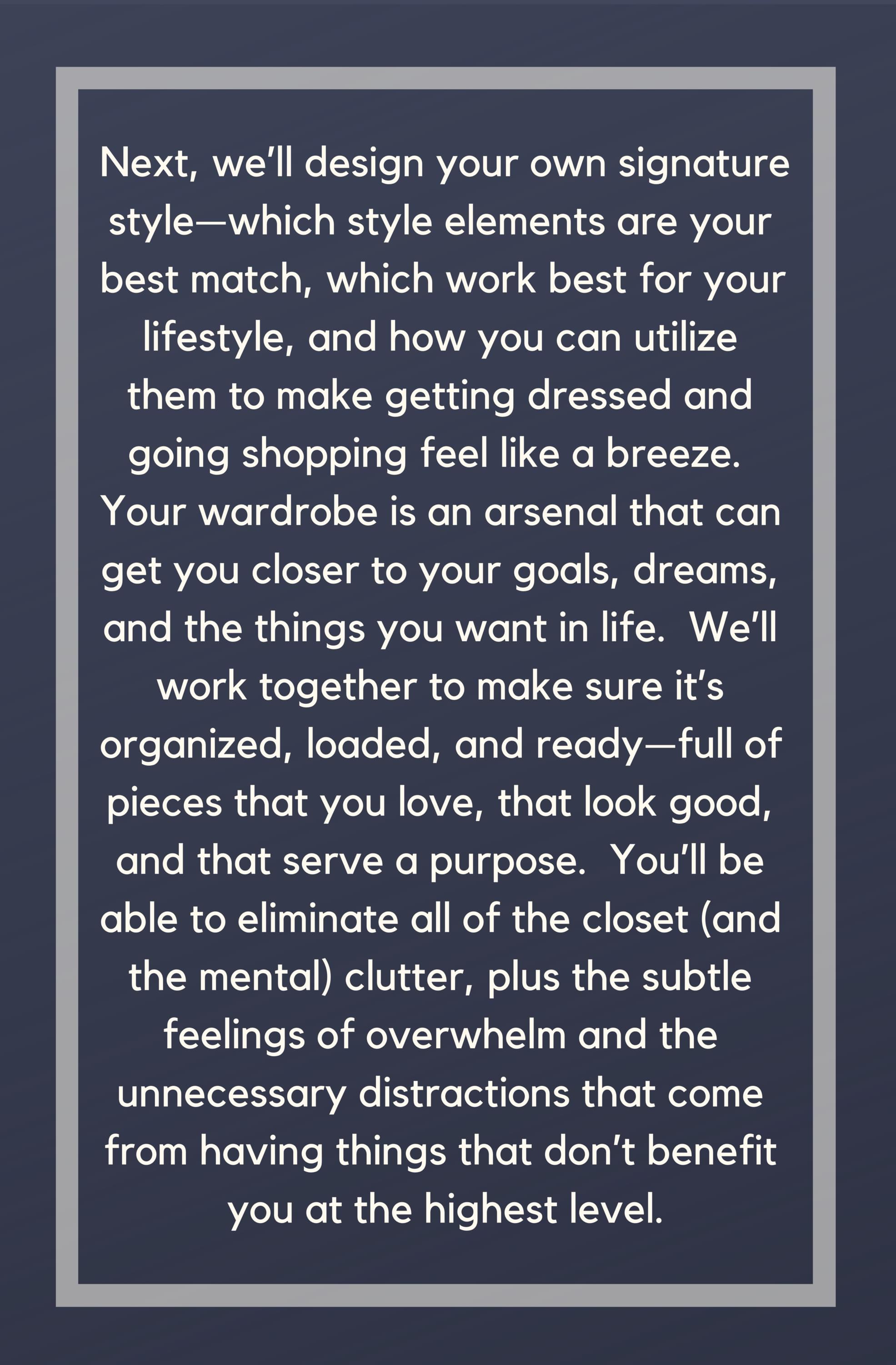 an opportunity to work with Courtney on elevating your personal style + defining a path to your ideal lifestyle through a unique, co-creative experience designed to increase success, reduce stress, and make your goals a reality
